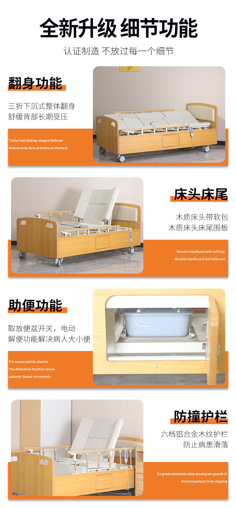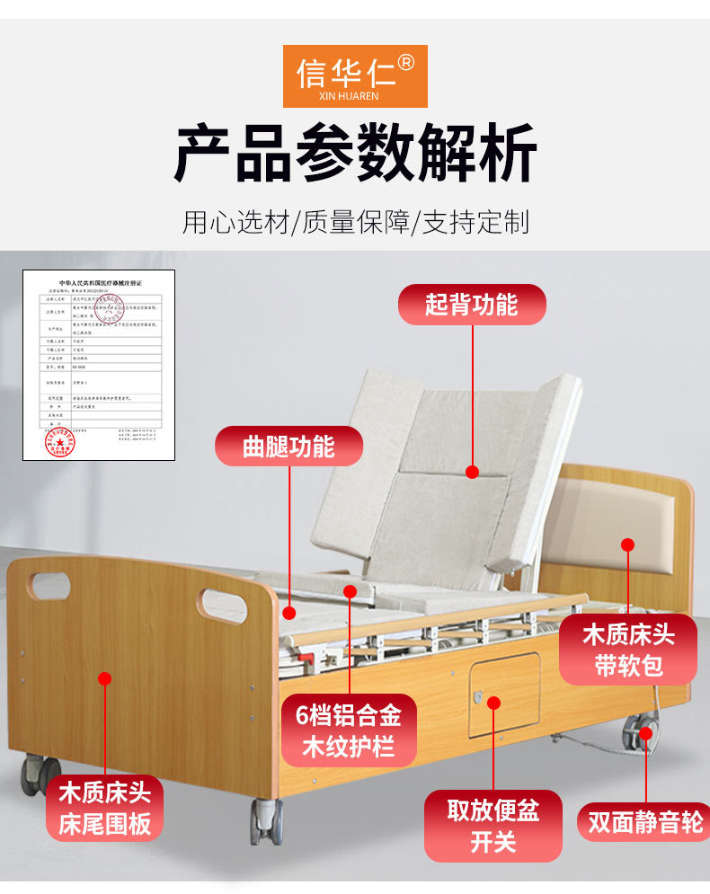 標準配置:木質(zhì)床頭床圍板1套;鋁合金折疊護欄1套;輸液架1套;